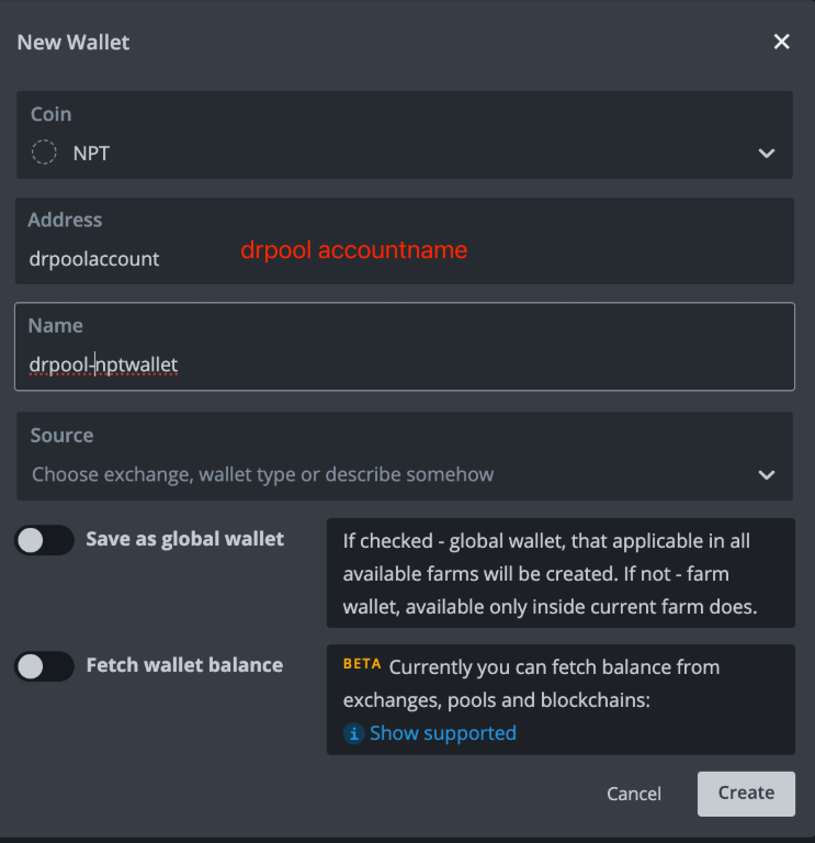 Wallet → 添加钱包 → 地址填写你的 DRPool 账号名