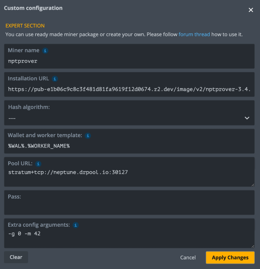 ./dr_neptune_prover -p stratum+tcp://xnt.drpool.io:30120 -w drpool.xxx -g 0,1 -m 0